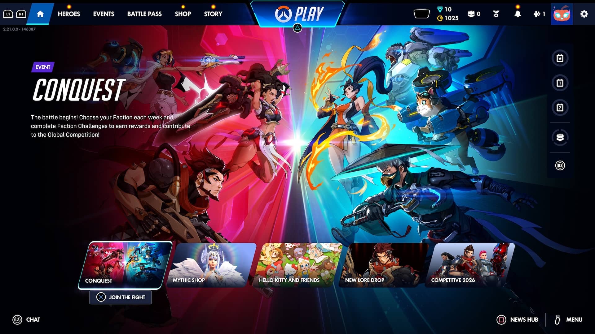 这次更新最核心的部分,在于整个 UI/UX 都贯彻了效率优先的原则,通过将跨功能跳转的交互成本降至线性来压缩玩家的操作路径。例如游戏大厅从以往的层级式结构转向了一个更加扁平的常驻导航栏设计,核心功能入口(如英雄浏览、活动、通行证、商城与故事)永久置于顶部,居中的「PLAY」按钮作为核心 CTA 始终占据视觉焦点,顶栏右侧则实时透出各类资产数额,确保关键信息一目了然。