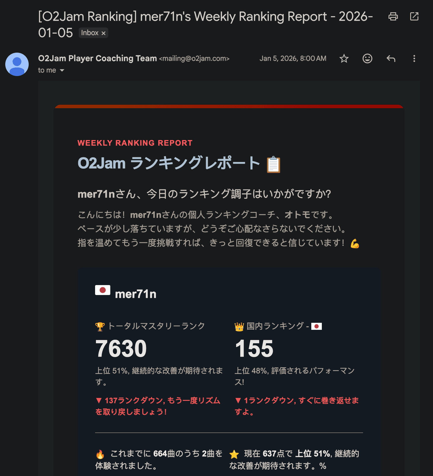 运营团队几乎已经失去了持续产出实质性内容的能力,陷入了一种高度自我感动的幻觉,请不起美术便依赖廉价 AI,缺乏技术实力便以宏大的营销话术进行包装。如果持续关注其日常运营,会明显感受到一种近似传销式的叙事结构:所谓的「大型活动」在其官方 X(Twitter)上用各国语言大肆渲染,仿佛进入了某种「盛典周期」,但点进去一看,只是某天某首歌曲的限时免费试玩;每周固定发送一封来自所谓「Coaching Team」的邮件,名称听起来像一种职业级别的指导,实质却只是一个 AI 生成的排名数据汇总。即便是极其基础的功能更新,例如新增一个收藏按钮,也会被描述成一次重大版本升级,甚至为此单独发布版本。