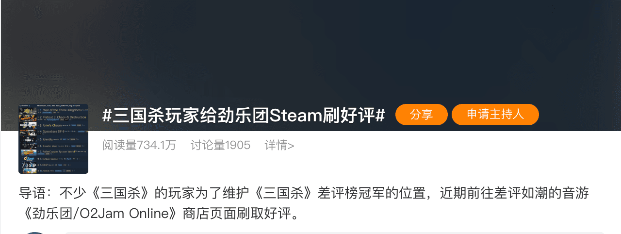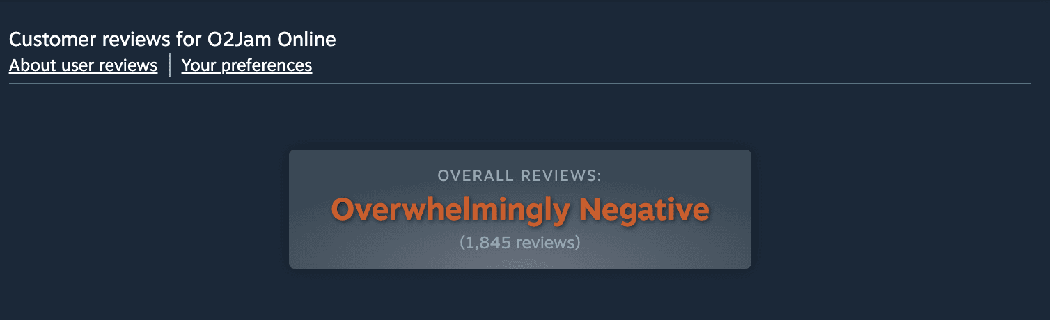 2023 年 1 月,《O2Jam Online》正式上线,不到 24 小时便成为 Steam 历史评分最低的游戏之一,甚至一度超越《三国杀》。部分《三国杀》玩家甚至出于维护差评榜首的目的,组团为其刷好评。这一现象本身也直观反映了该 IP 当时的尴尬处境。