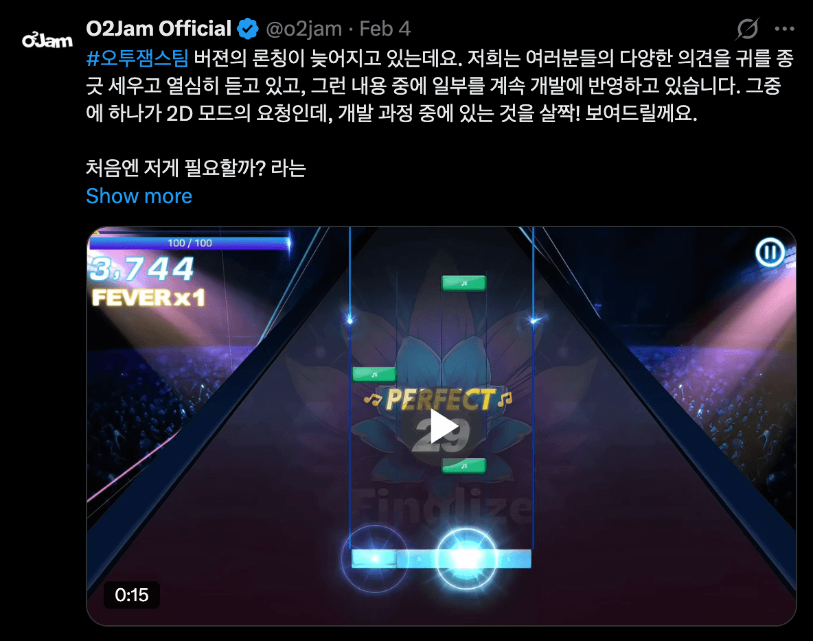 可以清晰看到的,只是一种托管式运营在 IP 价值彻底枯竭时的最后挣扎。当运营方既不具备重写核心代码的技术能力,也无力投入资源构建新的内容生态时,以 AI 作为门面、以营销黑话作为填充,已经成了唯一的路径,荒诞而诡异。至少在可预见的未来,《O2Jam》不会再有任何实质性进展,毕竟,该公司的社长如今似乎更关心特斯拉的 FSD,以及日本人能不能进入景福宫。