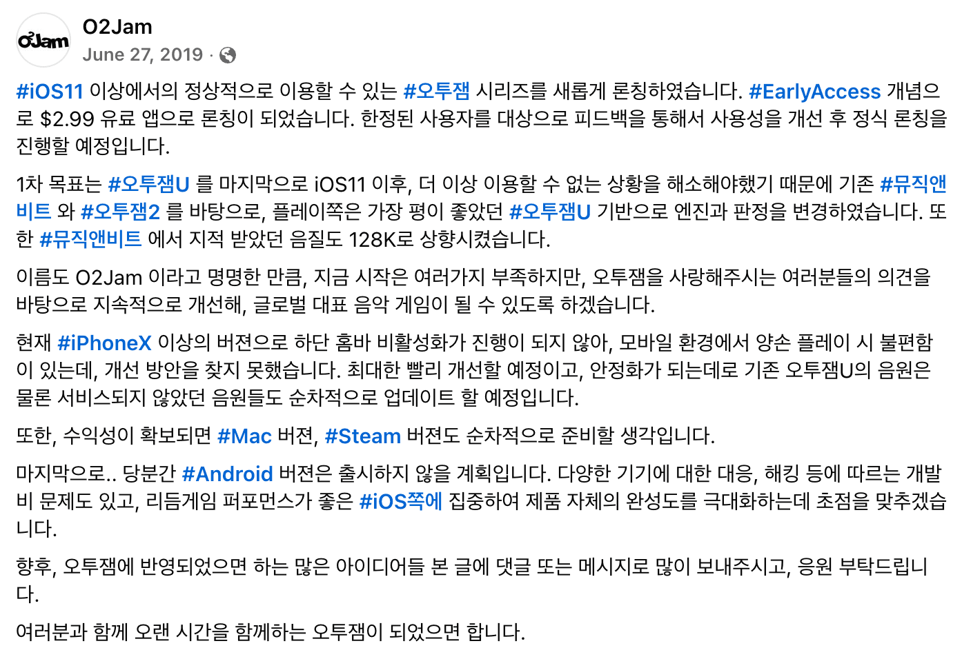 2019 年,O2Jam Company 突然在 App Store 上架了一款名为《O2Jam - Music & Game》的买断制手游,价格 18 元人民币。官方在 Facebook 页面 公开表示:“如果实现盈利,计划依次推出 Steam 版和 Mac 版”。但该作完全基于此前的半成品《O2Jam - Music & Beat》,仅剥离了所有在线功能后重新发布,几乎完整继承了前作的全部缺陷。即便提及了音源提高至 128kbps 的改进,但依旧没有修复单声道的问题。