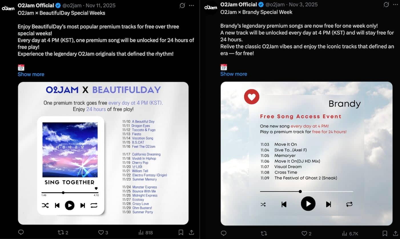 2025 年,《O2Jam》IP 的开发再次由 VALOFE 转回 O2Jam Company。O2Jam Company 随后又将《O2Jam - Music & Game》手游调整为免费加订阅的运营模式,并宣称将进入长期更新阶段。然而,项目很快呈现出一种极为诡异的状态。官方在 X(Twitter)上大量使用 AI 生成的插图作为宣传素材,反复营造复兴经典的叙事,但现实中的游戏本体,却连最基本的判定稳定性与音画同步都无法保证,UI 也没有任何改进。