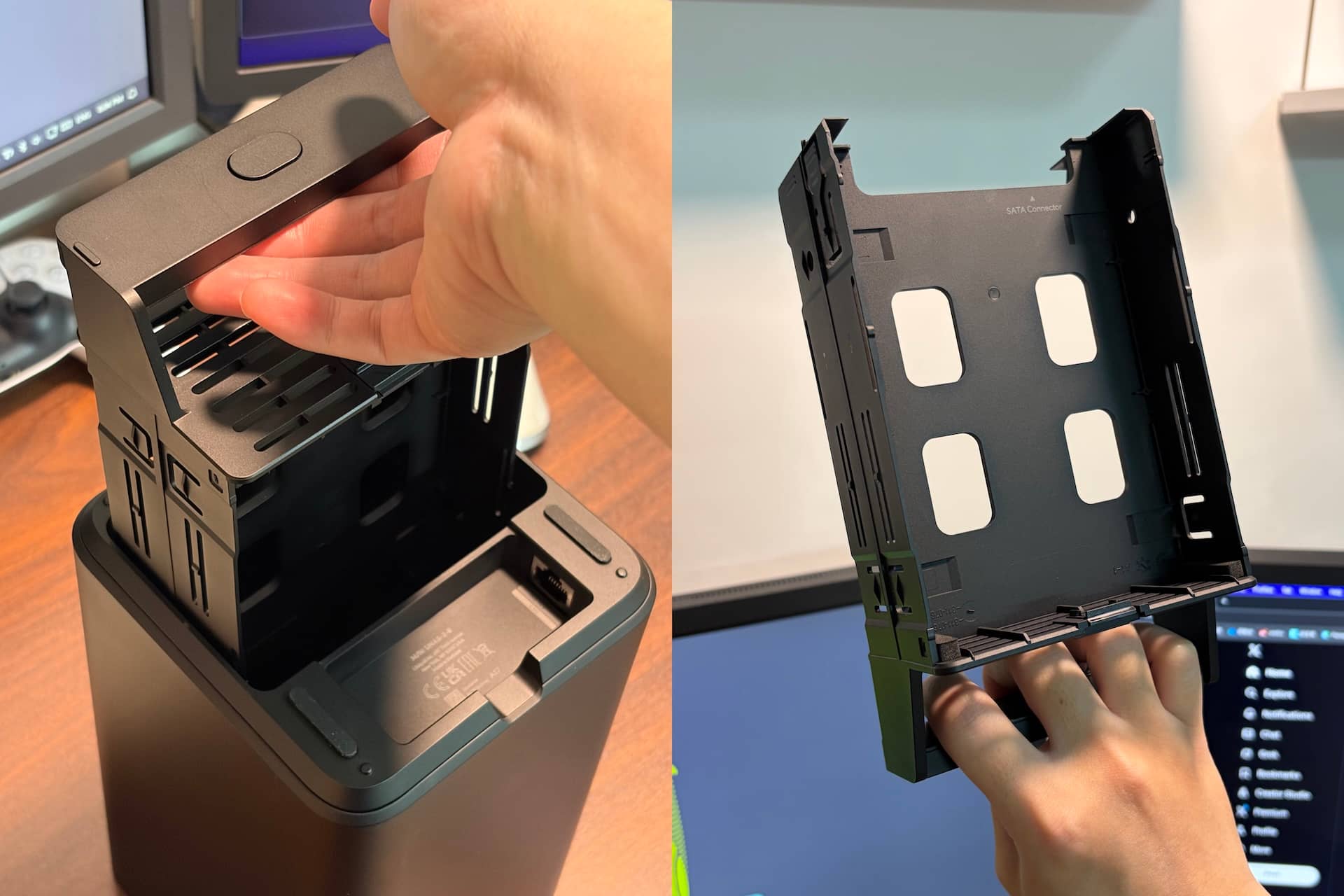 UNAS 2 的体积非常小,约 135 × 129 × 223.7 mm,重量只有 1.3 kg,外壳为聚碳酸酯材质,整体设计上明显就是奔着桌面使用而来。一体化的设计干净利落,但也带来一些使用上的不便,它不支持热插拔,两块 3.5 英寸硬盘共用一个托架,不适合需要频繁拆卸或维护的使用场景,更像是一台在部署之初就需要规划好容量,并长期固定使用的设备。