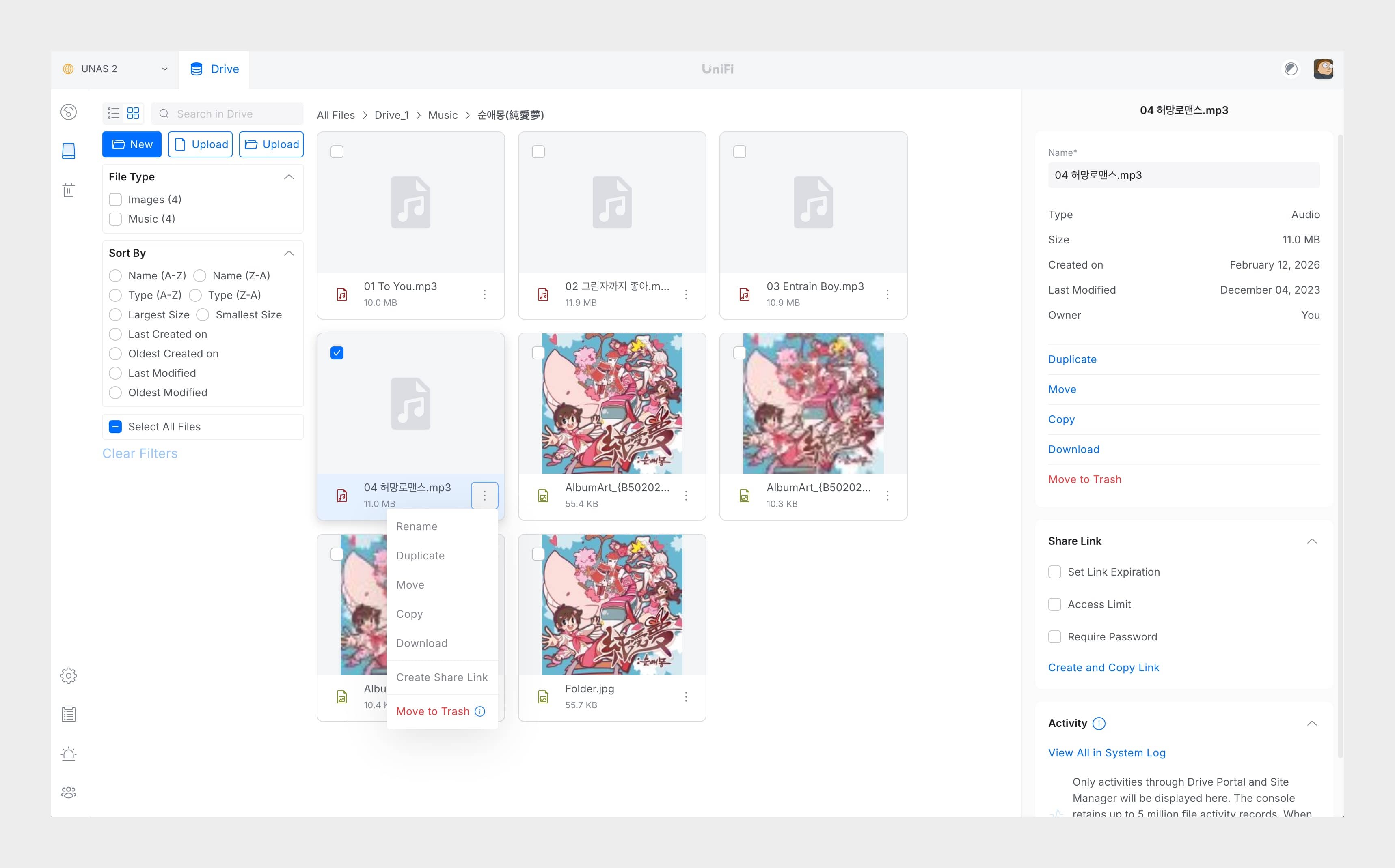 UNAS 2 运行 UniFi NAS OS,通过 Drive 应用集成在 UniFi Web Console 中,并与 ui.com 账号体系关联。UI 延续了 UniFi 一贯的简洁和统一,功能边界清晰,同时支持远程访问与链接共享等功能。进阶配置选项相对有限,但一定程度上也降低了运维复杂度,更贴近即插即用的产品定位。